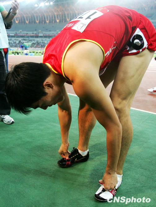 10月24日晚,全運(yùn)會(huì)110米欄預(yù)賽在濟(jì)南奧體中心舉行,“飛人”劉翔以13秒75成績(jī)輕松晉級(jí)決賽。圖為在比賽結(jié)束后劉翔解開(kāi)了鞋帶。 中新社發(fā) 富田 攝