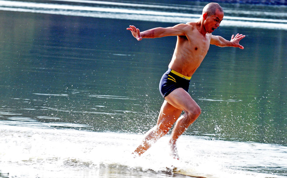 泉州南少林武僧釋理亮借助三合板上演少林絕技“水上漂”,在水面“飛奔”了18米遠。那么,釋理亮的“水上漂”功夫是如何練成的呢?