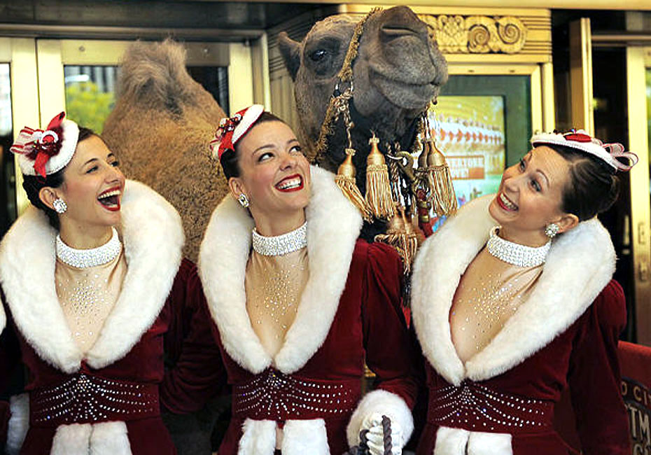 10月29日,火箭女郎舞蹈團的姑娘們在美國紐約廣播城音樂廳與眾多動物明星合影,準備在圣誕秀上亮相。圖片來源:中國新聞網