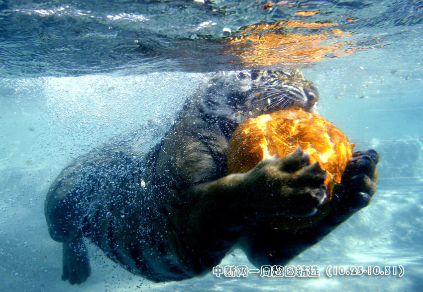 10月28日,美國加利福尼亞州Vallejo,六旗探索王國游樂園里的孟加拉虎在水下撕咬萬圣節(jié)南瓜。>>點擊觀看詳細(xì)內(nèi)容