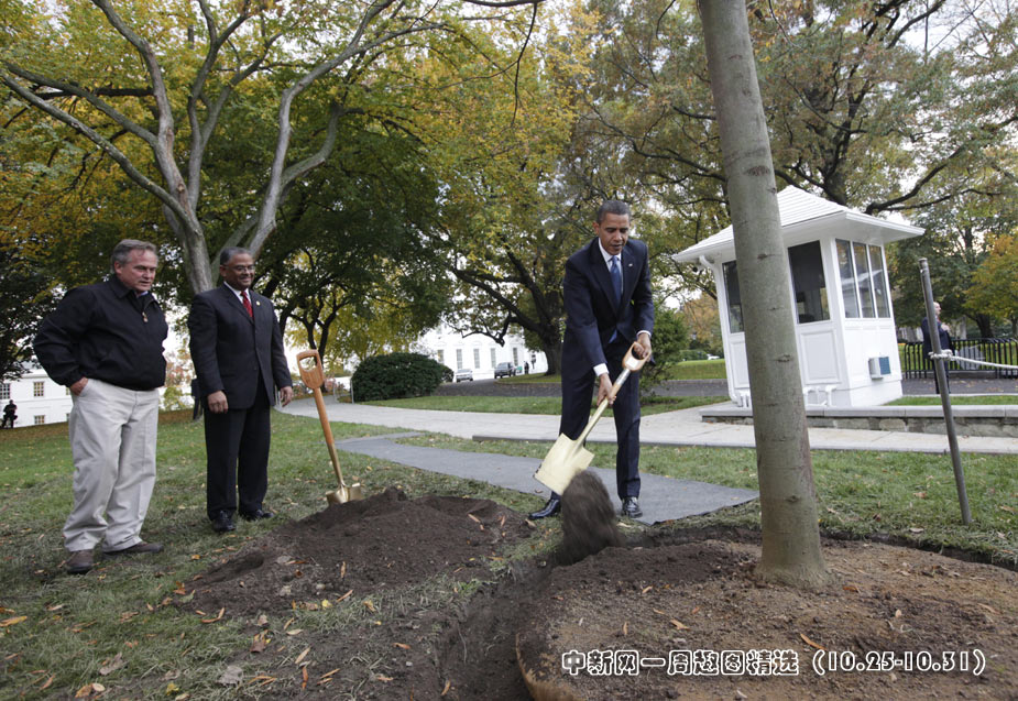 10月28日,美國華盛頓,總統奧巴馬在白宮北草坪上植樹。前總統布什曾于2008年4月在同樣的位置種下一棵樹,但未能成活。>>點擊觀看詳細內容