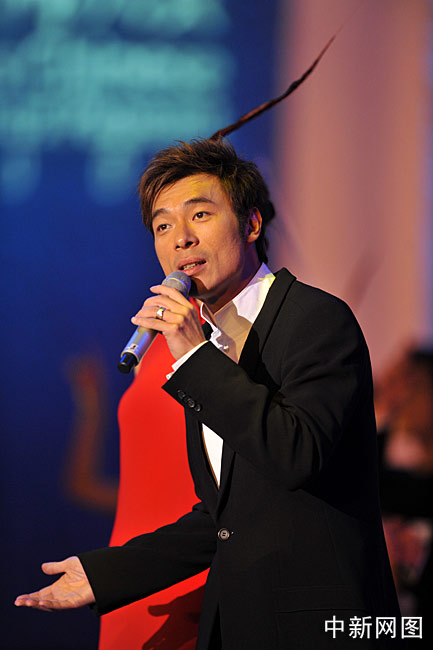 圖為許志安現(xiàn)場(chǎng)演唱歌曲助興。