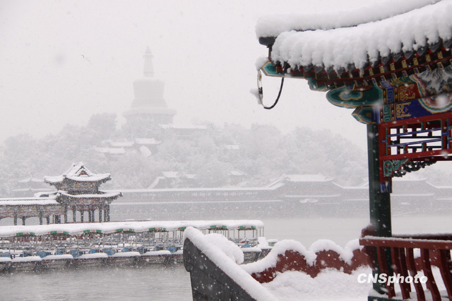受冷空氣影響,十一月一日北京降下今冬首場瑞雪。北海公園大雪紛飛,銀裝素裹。中新社 發(fā) 史利 攝