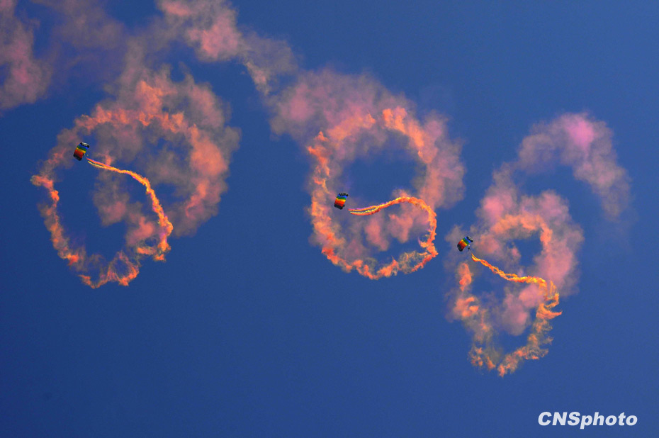 十一月三日,空軍八一飛行表演隊和空軍八一跳傘隊在北京沙河機場舉行預演,迎接十一月十一日中國人民解放軍空軍建軍六十周年。圖為空軍八一跳傘隊表演。中新社發 潘旭臨 攝