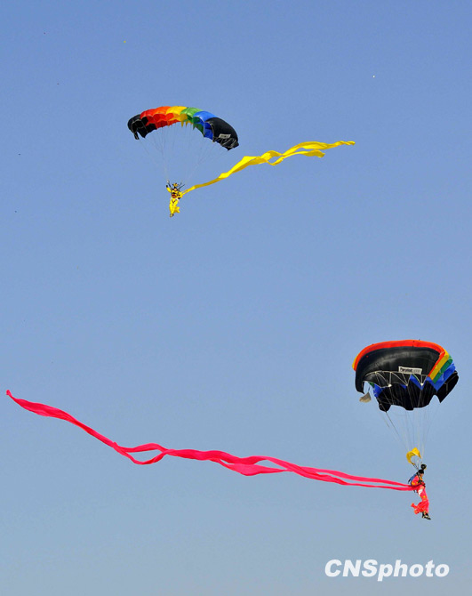 十一月三日,空軍八一飛行表演隊(duì)和空軍八一跳傘隊(duì)在北京沙河機(jī)場舉行預(yù)演,迎接中國人民解放軍空軍建軍六十周年。圖為空軍八一跳傘隊(duì)表演的仙女下凡。中新社發(fā) 潘旭臨 攝