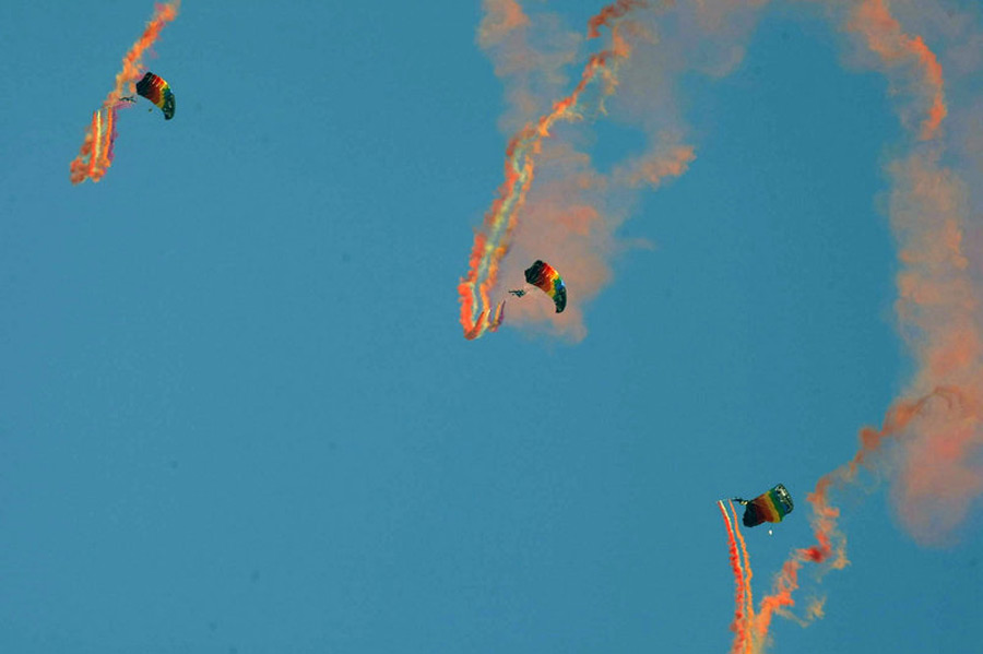 11月3日上午,慶祝空軍建軍60周年空中表演在沙河機場舉行首場預演。八一跳傘隊共有24名隊員表演開路先鋒、空中彩虹、歡慶盛典和仙女下凡4個節目。黑克 張穎川 攝