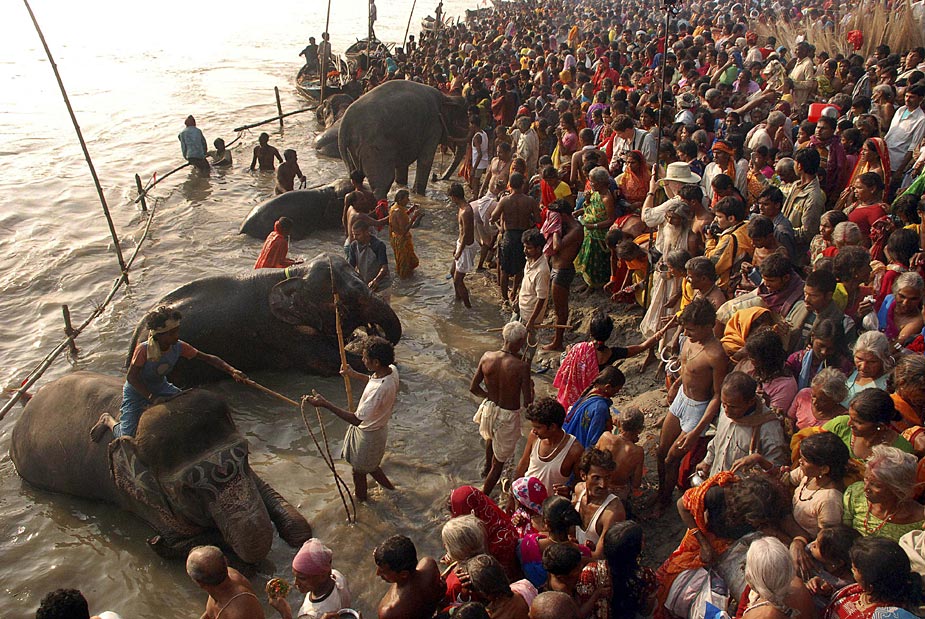 周一(2日),印度教信徒在印度卡爾蒂克為大象沐浴慶祝沐浴節。來源:中國新聞網
