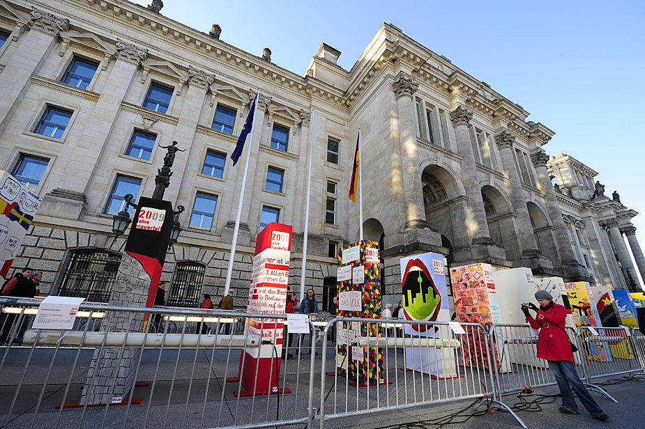 周五(6日),為了紀(jì)念柏林墻倒塌20周年,德國(guó)柏林的勃蘭登堡門附近擺放了一排墻體模型。來(lái)源:中國(guó)新聞網(wǎng)