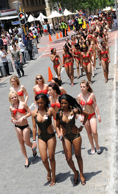 11月7日,南非的約翰內斯堡正值夏天,將近300位身穿比基尼泳裝的女郎齊聚游行。希望借此打破最大規模比基尼游行吉尼斯紀錄。