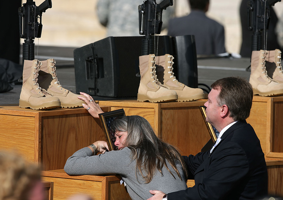 2009年11月10日,在美國得克薩斯州胡德堡陸軍基地,槍擊案遇害士兵的親屬參加悼念儀式。當日,美國德克薩斯州胡德堡陸軍基地舉行儀式悼念槍擊案遇難者。 圖片來源:中國新聞網