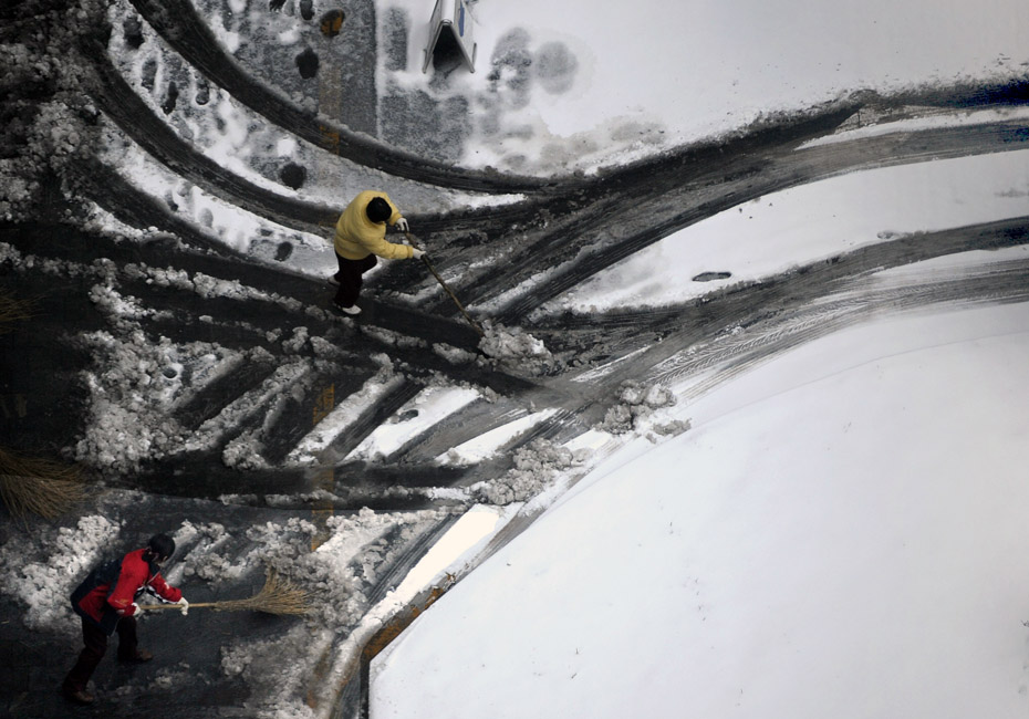 圖為11月10日人們在北京一棟公寓樓下清除積雪。