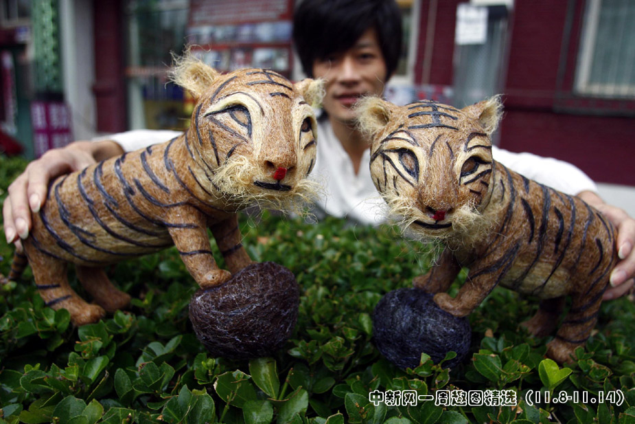11月9日,北京一位時尚發(fā)型設計師正在展示頭發(fā)絲作品“福虎神威”賀歲虎年。這是祖國60華誕之后的又一新作,四川青年理發(fā)師黃鑫用2.6公斤碎頭發(fā)制作了一對可愛逼真的“福虎”,歷時兩個多月的時間才完工。>>點擊觀看詳細內容
