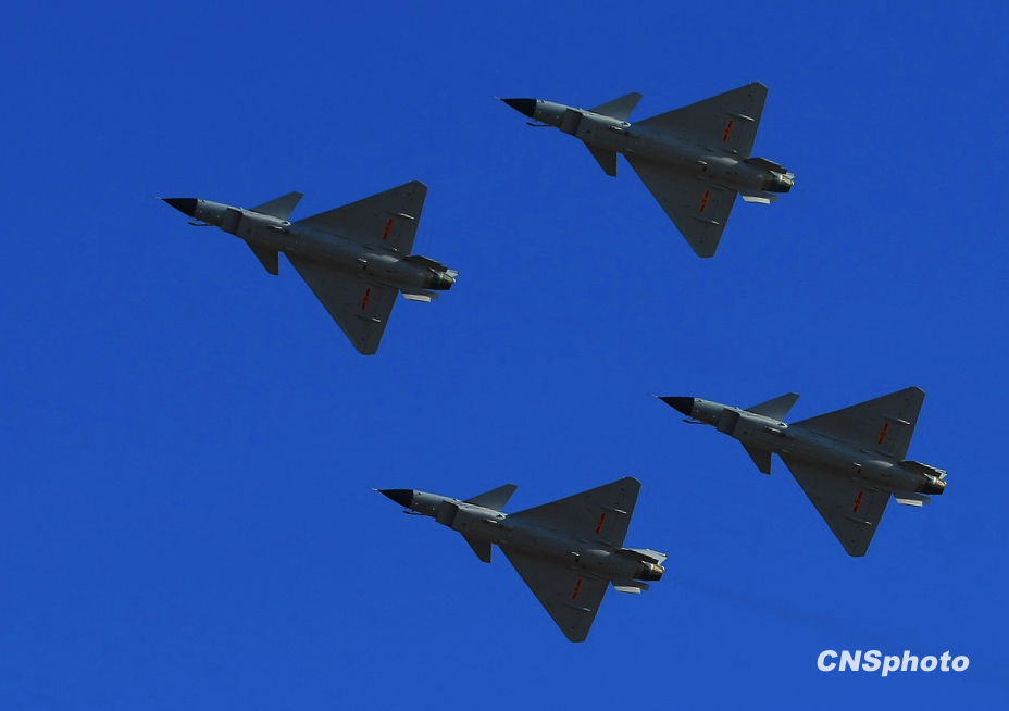 慶祝中國人民解放軍空軍成立60周年飛行表演,11月15日上午在北京沙河機(jī)場舉行。表演按八一飛行表演隊(duì)4架殲-10飛機(jī)表演12個(gè)動(dòng)作和6架殲-7GB飛機(jī)表演15個(gè)動(dòng)作,分四機(jī)對頭交叉、四機(jī)菱形隊(duì)大坡度盤旋、單機(jī)小速度平飛等27個(gè)動(dòng)作,其中四機(jī)對頭交叉動(dòng)作是這次表演中技術(shù)難度較大的動(dòng)作之一,這是國產(chǎn)三代飛機(jī)和國產(chǎn)二代飛機(jī)首次同場競技表演。圖為八一飛行隊(duì)殲-10進(jìn)行表演。中新社發(fā) 宋吉河 攝