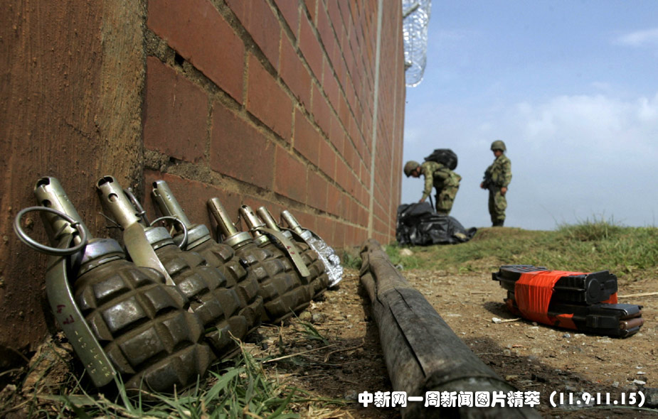 10日(周二),被反叛人員殺死的哥倫比亞士兵的手雷擺放在墻角。圖片來源:中國新聞網