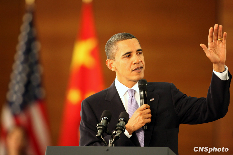 11月16日,正在上海訪問的美國總統奧巴馬現身位于浦東的上海科技館,與四百余中國青年進行面對面交流。 圖片來源:中國新聞網