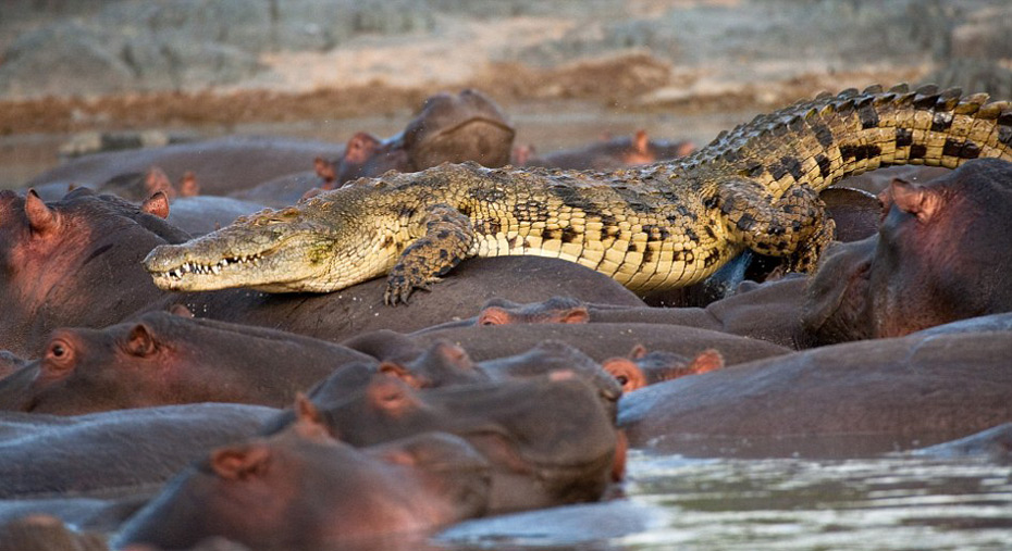 一條鱷魚悄悄混入了正在河里洗澡的河馬中,它很快就被敏感的母河馬發(fā)現(xiàn)。憤怒的河馬們立刻對它發(fā)起了猛烈地攻擊,這條冒失的鱷魚很快死于非命。