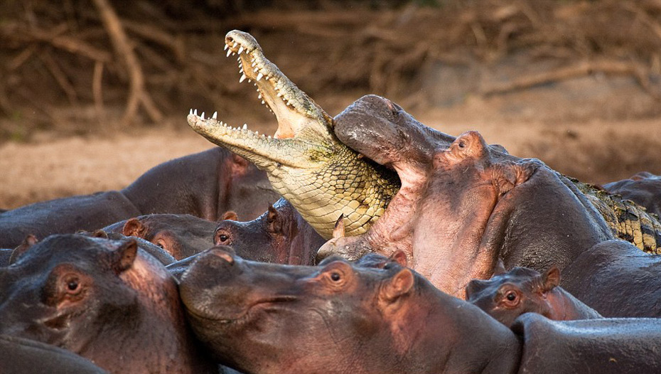 45歲的捷克野生動物攝影師Vaclav Silha日前在坦桑尼亞塞倫蓋蒂國家公園里拍攝到了非常令人震撼的場面。當(dāng)時(shí),一條鱷魚悄悄混入了一群正在河里洗澡的河馬中,但由于與一頭帶著小河馬的河馬媽媽太過接近,它很快就被敏感的母河馬發(fā)現(xiàn)。憤怒的河馬們立刻對它發(fā)起了猛烈地攻擊,這條冒失的鱷魚很快死于非命。這組照片中的一張最早刊登于英國廣播公司(BBC)《野生動物》雜志的11月號。