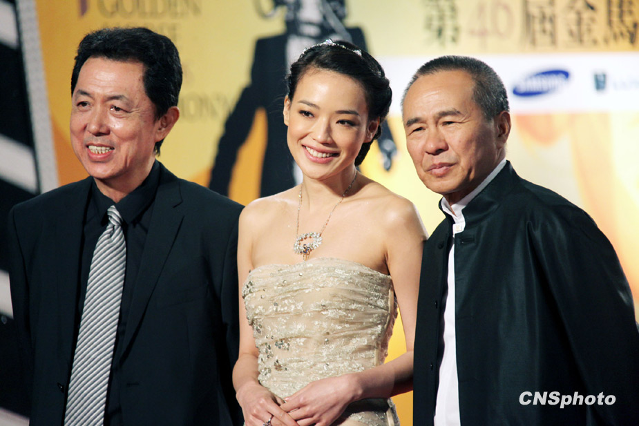 第46屆臺灣金馬獎頒獎禮28日晚上在臺北盛大舉行。著名導演朱延平(左)、侯孝賢(右)和影星舒淇(中)聯袂出席。中新社發 黃少華 攝