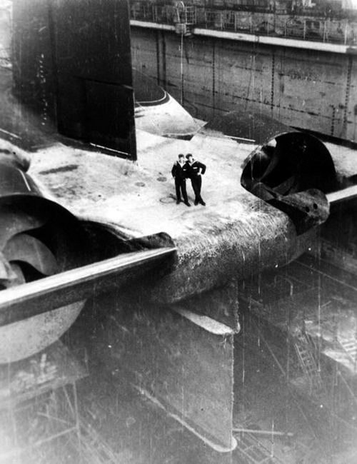 圖為兩名水兵站在“臺風”碩大無比的尾部。圖片來源:人民網