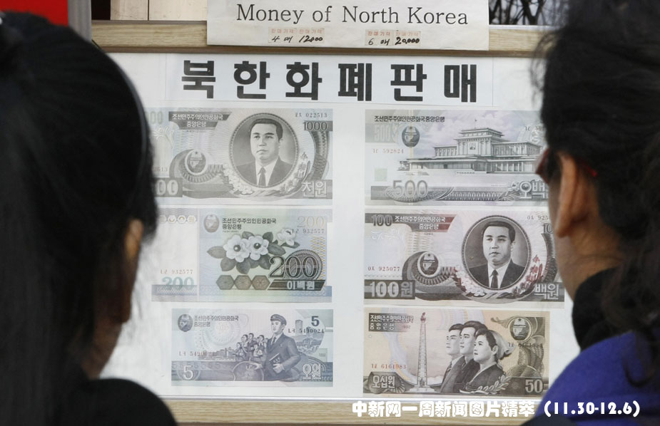 12月1日,韓國板門店一側(cè)的韓國游客正在一塊展板前看新出的朝鮮貨幣。據(jù)朝鮮官員當日對外透露,朝鮮于11月30日更換了貨幣,這是該國十七年來首次更換貨幣。新舊貨幣兌換率為100比1。圖片來源:中國新聞網(wǎng)