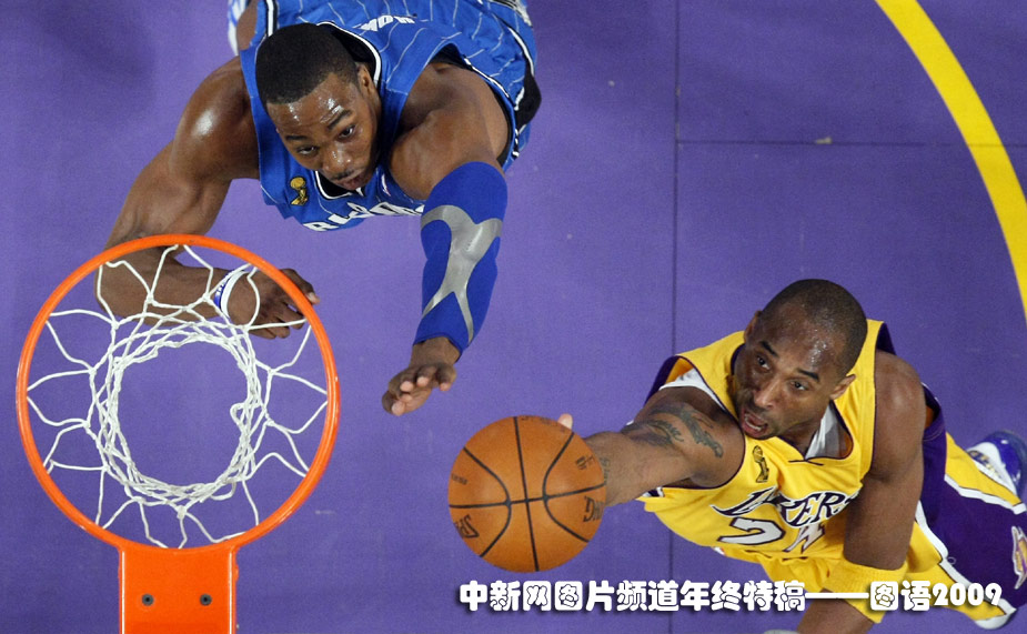 6月5日,NBA總決賽洛杉磯湖人隊迎戰奧蘭多魔術隊,兩隊當家球星科比布萊恩特與“魔獸”霍華德在籃下“斗法”。