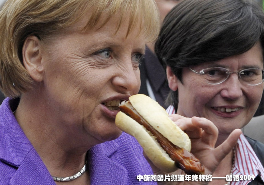 美食的誘惑:2009年9月27日,德國總理默克爾在德國東部愛爾福特市訪問時(shí),大吃香腸。
