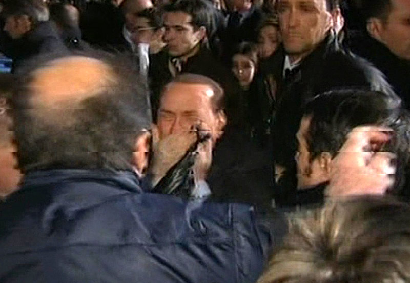 時值政治盟友沖刺階段,貝盧斯科尼照例參加自己黨派的集會。就在他給支持者簽名時,人群中一名中年男子突然毆打其面部。當地電視臺畫面顯示,跌倒在地的貝盧斯科尼被助手扶起時,口鼻出血,面部淤青,表情痛苦。