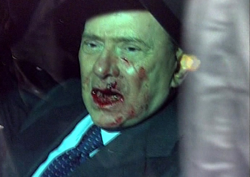 意大利總理貝盧斯科尼13日晚間受邀在米蘭參加一個(gè)集會(huì)時(shí)遭到襲擊,面部受傷流血,隨后被緊急送醫(yī)治療。圖片來源:中國新聞網(wǎng)