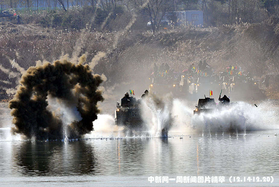16日(周三),韓國第20師團機械化部隊在京畿道驪州南漢江一帶進行大規模渡河實戰訓練。該訓練以培養戰斗執行能力為重點。圖片來源:中國新聞網