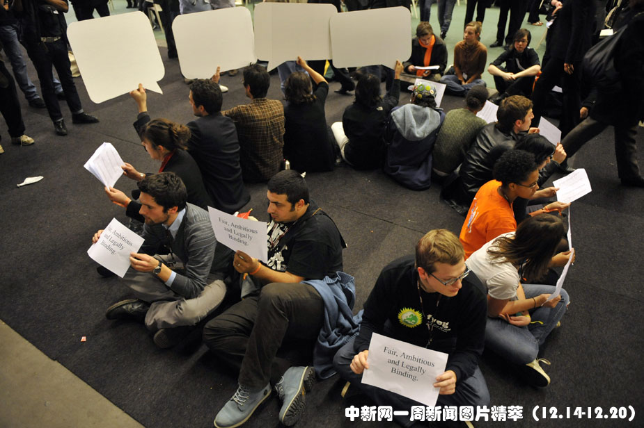16日(周三),哥本哈根,一群年輕人在貝拉中心靜坐示威,要求聯合國氣候變化大會取得實質成果。圖片來源:中國新聞網