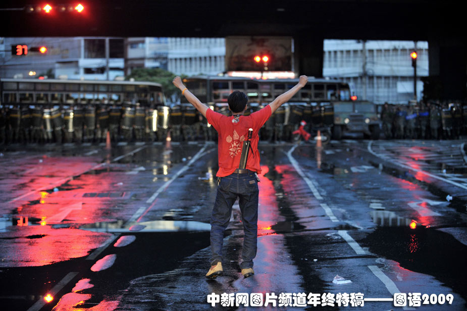2009年4月13日,一位泰國總理他信的支持者在曼谷街頭和軍警對峙。