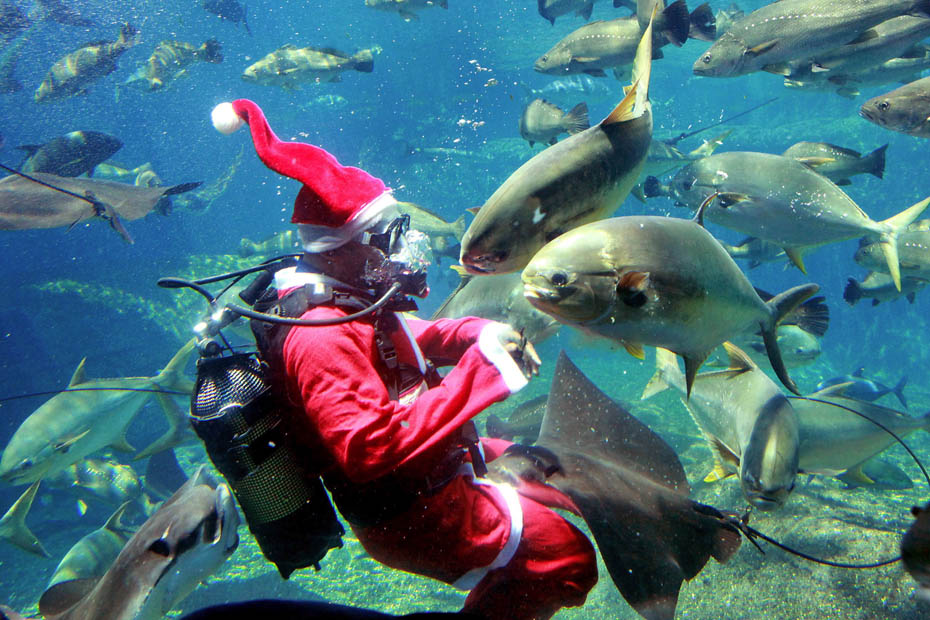 圖為迪拜海底世界主題公園內一個身著圣誕老人服裝的飼養員在水中喂食。