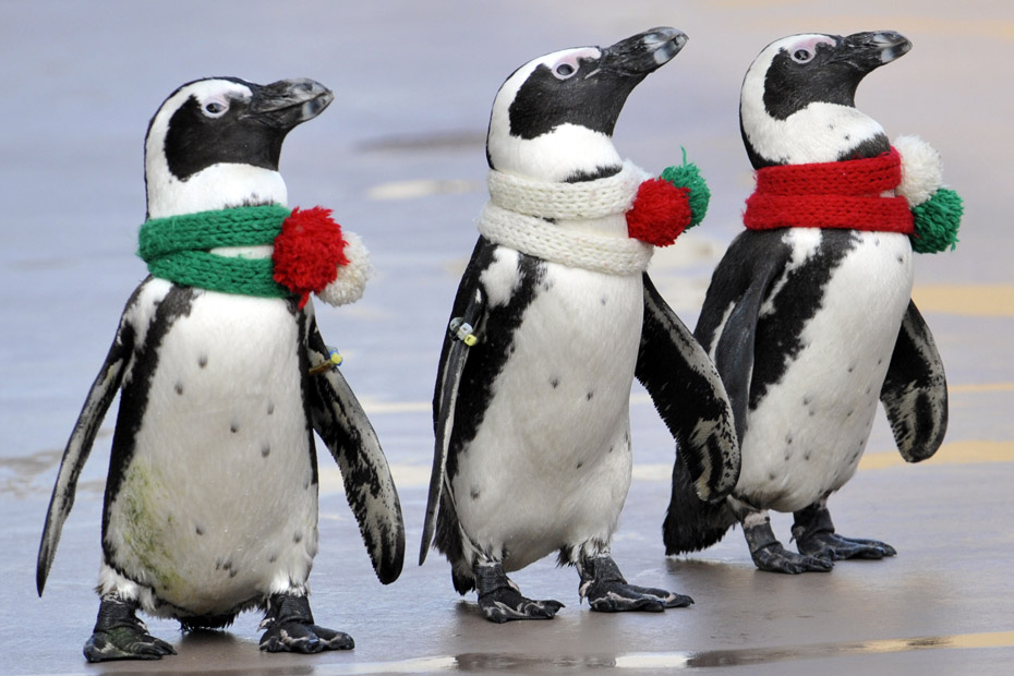 圖為東京橫濱八景島海洋樂園的企鵝披著圣誕圍巾在路邊行走。
