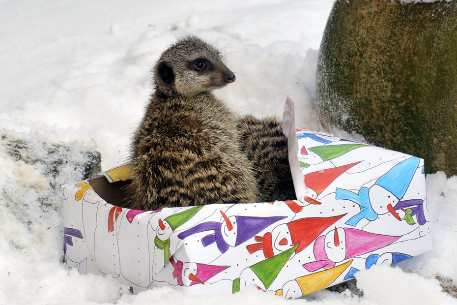 圖為德國北部城市漢諾威動物園幾只收到了圣誕禮物的狐獴。