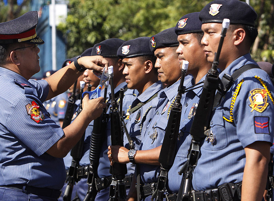 12月29日,菲律賓首都南部的塔吉格市警察部隊為了防止警務人員在慶祝新年時胡亂開槍,下令用膠紙把槍口封起來。圖片來源:中國新聞網