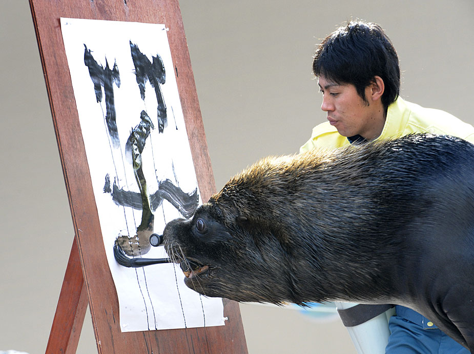 12月30日,日本神奈川八景島海洋樂園水族館內(nèi),海獅表演了用毛筆在紙上“寫”漢字的節(jié)目。圖片來源:中國(guó)新聞網(wǎng)