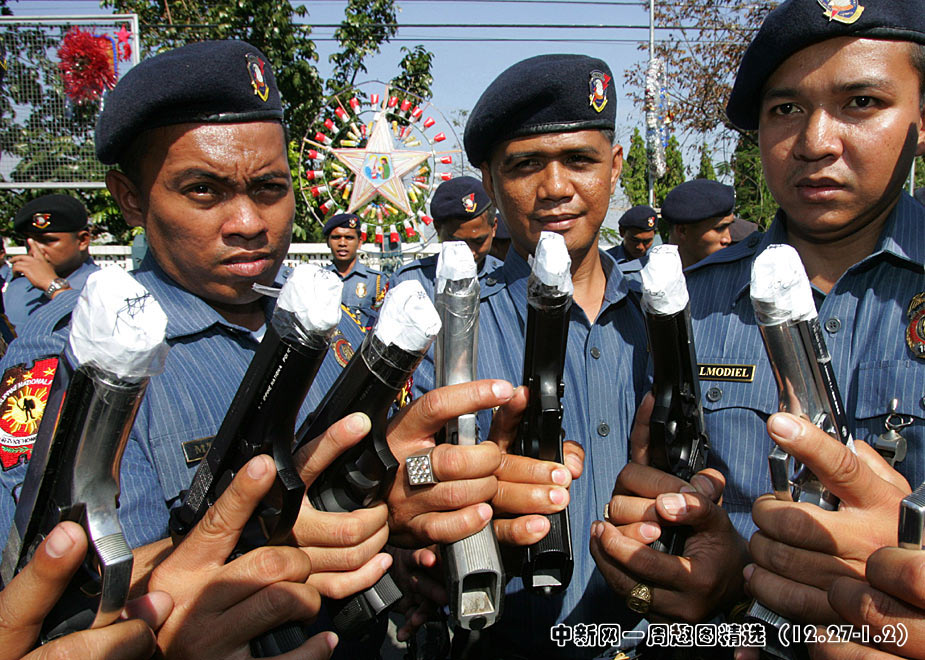 12月29日,菲律賓首都南部的塔吉格市警察部隊(duì)為了防止警務(wù)人員在慶祝新年時(shí)胡亂開槍,下令用膠紙把槍口封起來。圖片來源:中國(guó)新聞網(wǎng)>>點(diǎn)擊觀看詳細(xì)內(nèi)容