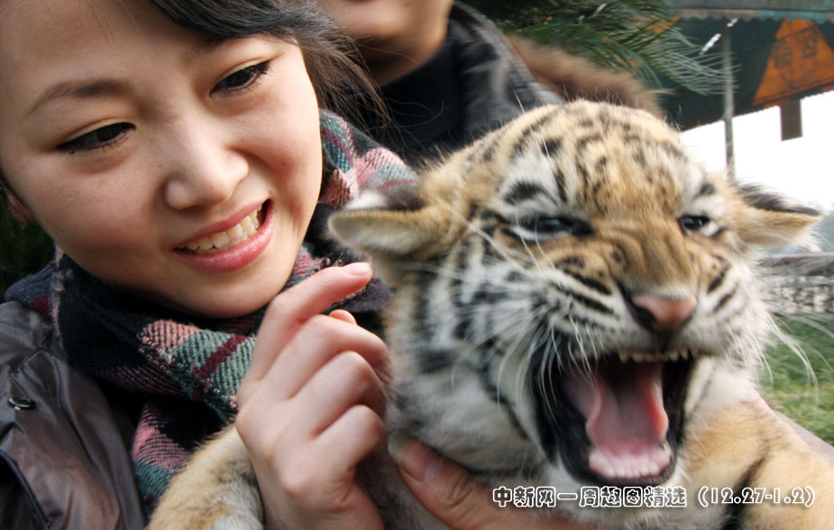 2010年1月1日,重慶野生動物世界把出生一個月的3胞胎小老虎抱到園區與游人親密接觸;⑨虃児郧煽蓯塾植皇涞男蜗笞層稳藧鄄会屖,游人們紛紛與之親密接觸、合影。圖片來源:中國新聞網>>點擊觀看詳細內容