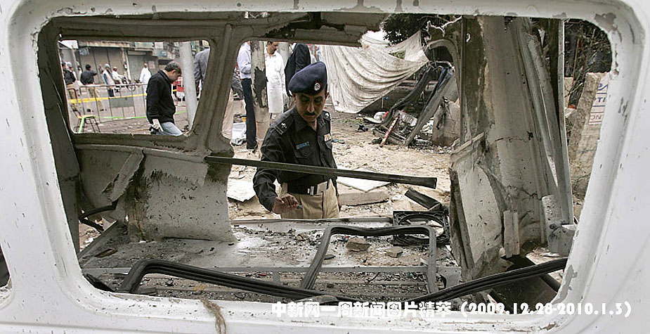 周一(28日),巴基斯坦卡拉奇發生一起自殺式爆炸襲擊事件。當地警方正在查看被損壞的車輛。圖片來源:中國新聞網