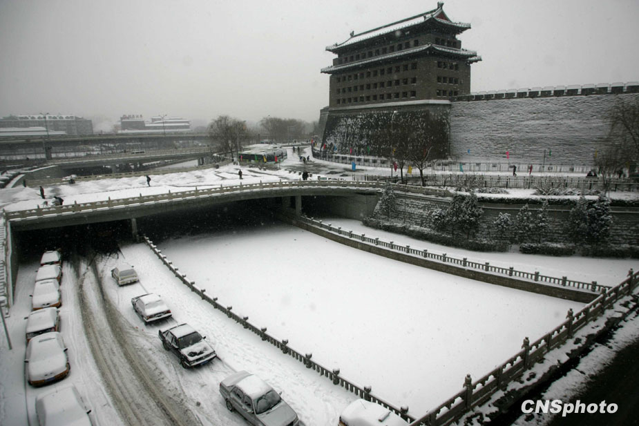 大雪中的德勝門更加美麗。中新社發 富田 攝