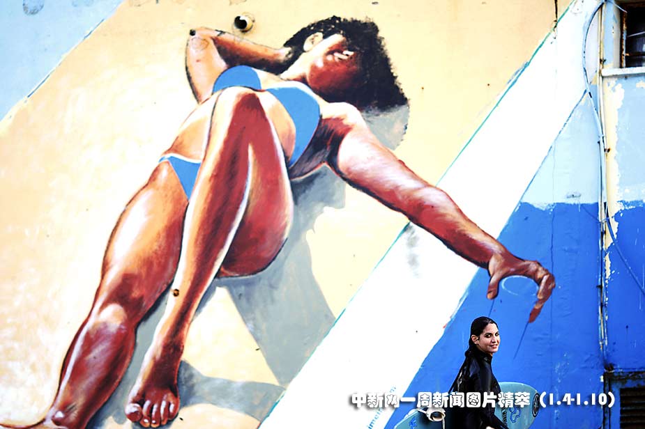 1月4日,(周一)在特拉維夫,一名女孩在地中海沖浪后走過一幅壁畫。當日海浪最高達8英尺。圖片來源:中國新聞網
