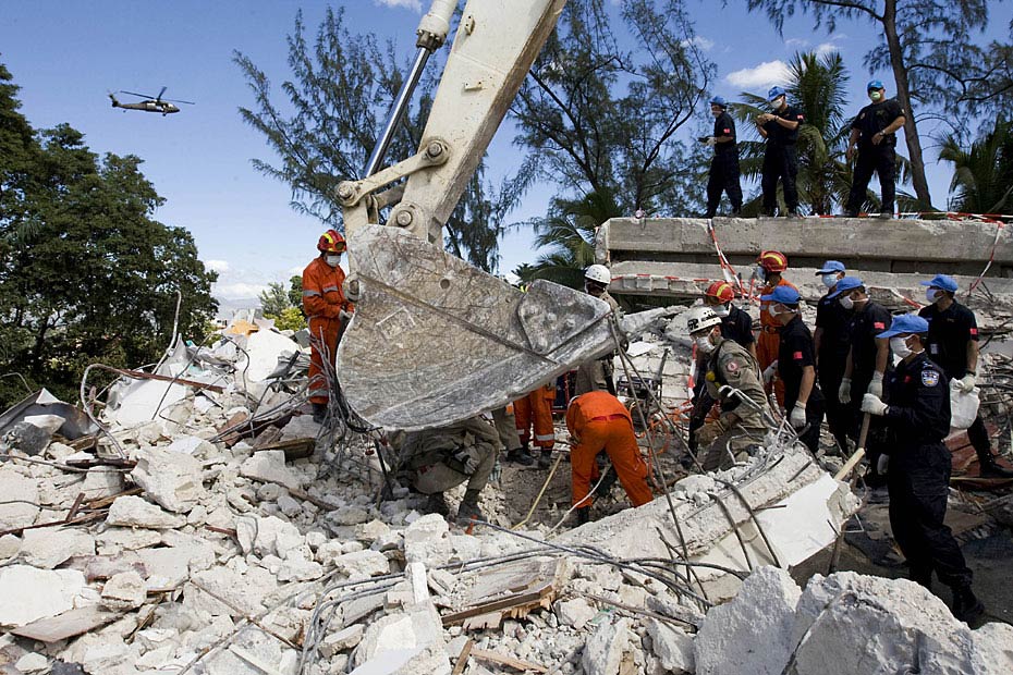 1月16日,海地首都太子港,中國(guó)國(guó)際救援隊(duì)在聯(lián)海團(tuán)總部對(duì)遇難者進(jìn)行搜尋工作。此前八名中方失蹤人員的遺體已全被找到。圖片來(lái)源:中國(guó)新聞網(wǎng)