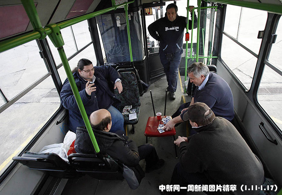 1月12日(周二),在布達佩斯一個汽車站,幾名司機在一輛城市公交車內打牌。他們從周二開始罷工,要求提高工資并簽訂新的勞動合同。圖片來源:中國新聞網