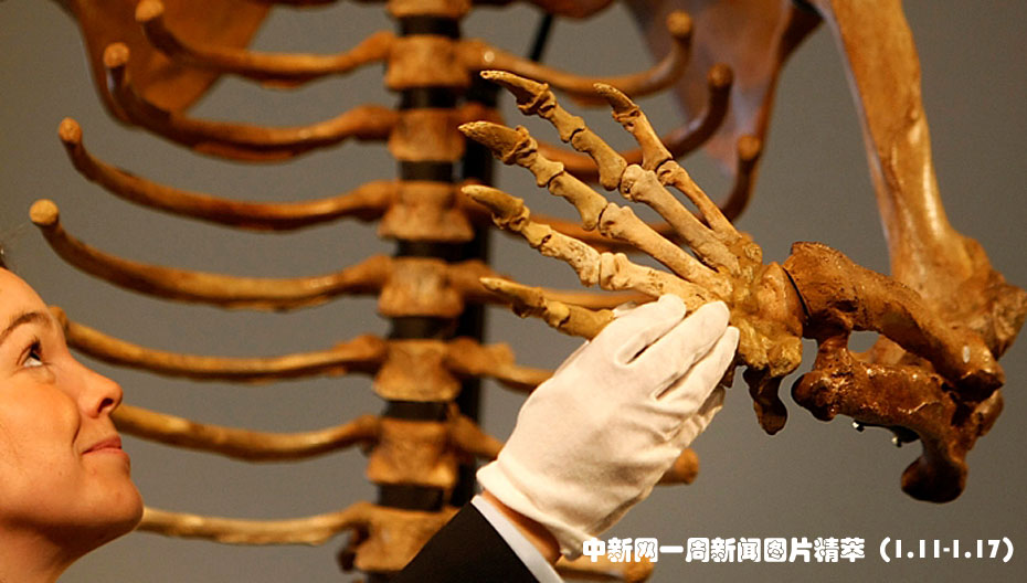 1月11日(周四),在倫敦,Bonhams拍賣行的工作人員正在查看一只冰河時期巨型熊的骨骼,其年代大約可追溯到5,000萬年前。這具骨骼有望拍得3萬至4萬美元。圖片來源:中國新聞網