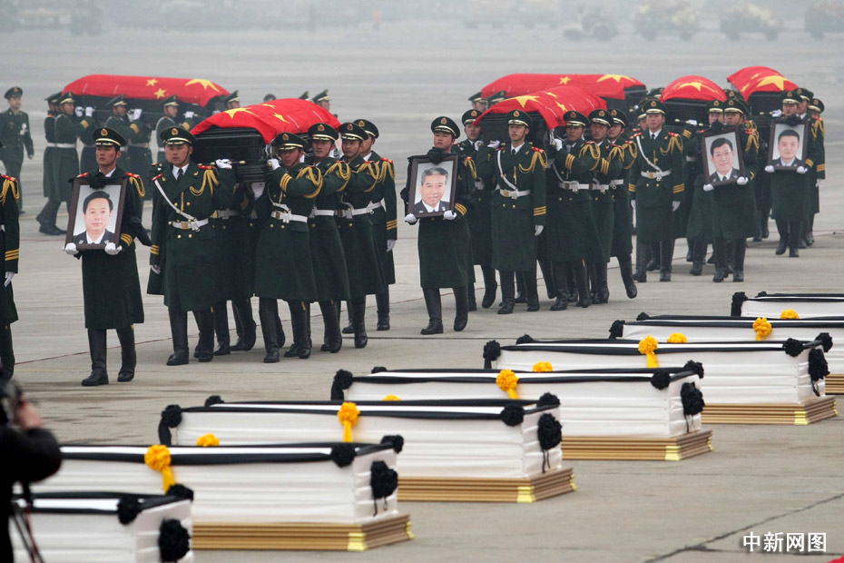 1月19日,禮兵護(hù)送八位烈士的靈柩,靈柩上覆蓋著中華人民共和國(guó)國(guó)旗。中新社記者 富田 攝