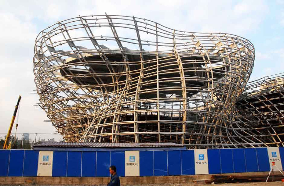 2010年1月21日上海迎來世博會開幕倒計時100天。世博會場館建設進入最后沖刺階段,部分場館已形象初顯。圖為“藤條籃子”造型西班牙館。鈕一新/CFP