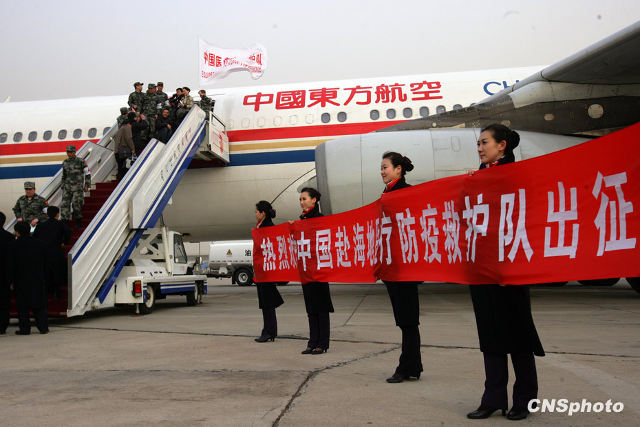 1月24日18時,由中國人民解放軍醫(yī)護人員和管理人員組成的中國醫(yī)療防疫救護隊一行40人乘坐軍運包機離開北京,啟程前往海地進行人道主義救援任務。
