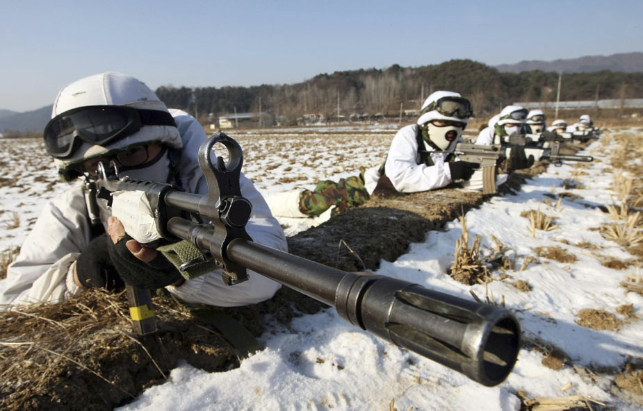 1月27日,韓國江原道,韓國陸軍部隊在嚴寒中進行戰術訓練。