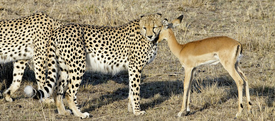 據(jù)英國(guó)媒體28日?qǐng)?bào)道,一名在肯尼亞野生動(dòng)物保護(hù)區(qū)拍照的攝影師拍到令人驚訝的畫(huà)面:三只獵豹與一只本是其獵物的小羚羊竟然和睦相處,共同嬉戲玩鬧,完全沒(méi)有危險(xiǎn)“天敵”的概念。小羚羊最終毫發(fā)無(wú)傷地逃生成功。