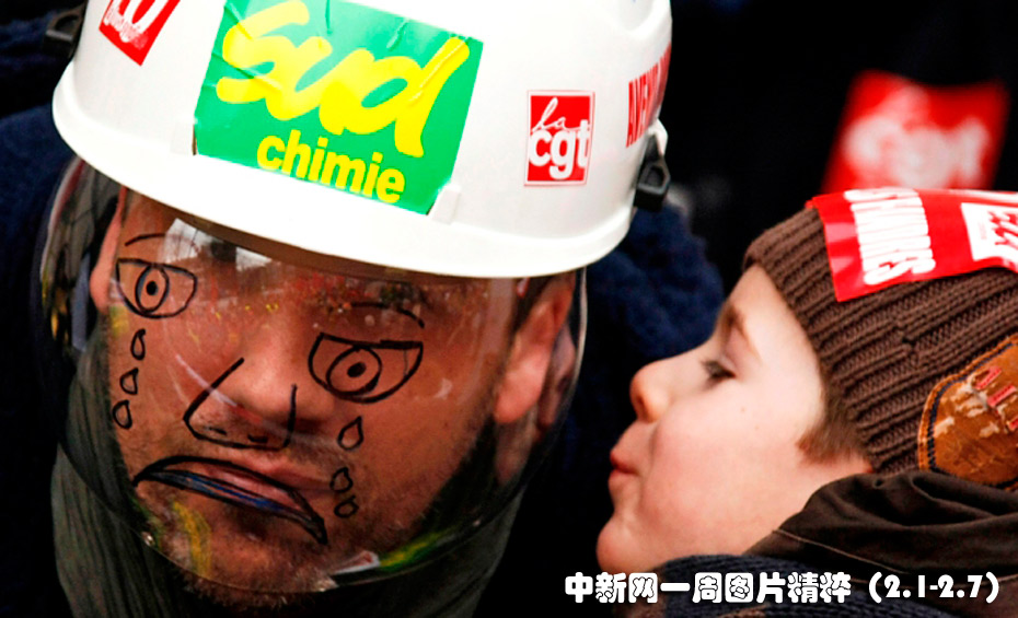 2月4日(周四),在法國敦克爾的罷工游行示威中,法國石油巨頭道達爾(TOTAL)的一名員工戴著頭盔,面罩上畫著一張哭泣的臉。自去年9月開始,敦克爾廠區就一直處于停工狀態。圖片來源:中國新聞網